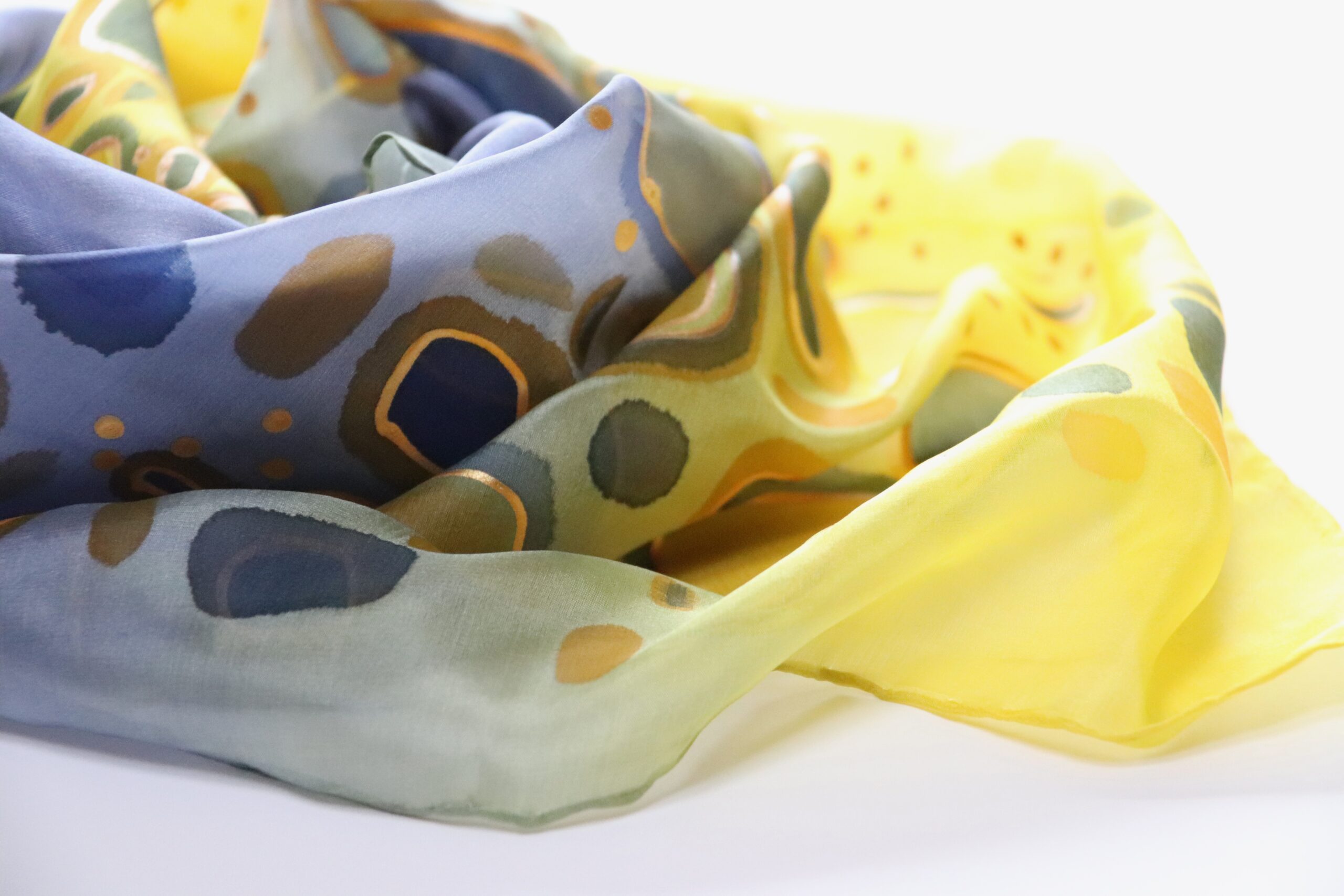 Šatka je veľmi jemná a príjemná na nosenie, neelektrizuje a neškriabe ako šatky z umelého hodvábu. Použla som odtiene modrej a žltej, dodekorovala zlatou. Šatka je vhodná ako darček, alebo originálny doplnok.