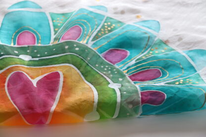 Motív srdiečka obkolesený farebnými pruhmi. Maľovala som akvarelovou technikou. Textúra šatky je zámerne pokrčená. Umocňuje tým ľahkosť a priedušnosť materiálu. Šatku je však možné po vypratí dohladka vyžehliť.